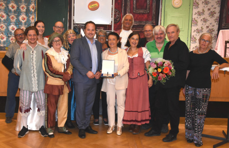 Bezirksvorsteher Daniel Resch verlieh Heidelinde Twaroch eine Urkunde als Dank für ihr Engagement als Intendantin des erfolgreichen und beliebten Neuen Theaters in Döbling.